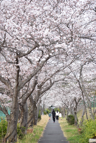 京都府福知山市内は先週末から、ひと月以上も先のような暖かさで、各地の桜が一気に咲き、瞬く間に満開近くになった。30日の最高気温は24・6度(午後1時43分)で、5月中旬並み。31日はあいにくの雨模様だが、暖かさは続いている。長田野工業団地内の遊歩道では、両側に植わっている桜の木の枝が重なり合い、今年も薄いピンク色の花のトンネルができた。