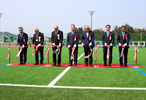 人工芝グラウンドは、学校敷地内の山を整備して造成。施工面積は3万2459平方メートルで、昨年7月に着工し進めてきた。シービル(半田)が設計、冨士興業(天田)が施工・監理を担った。