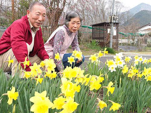 写真(クリックで拡大)=きれいに咲くスイセンをながめる瀬田さん夫婦