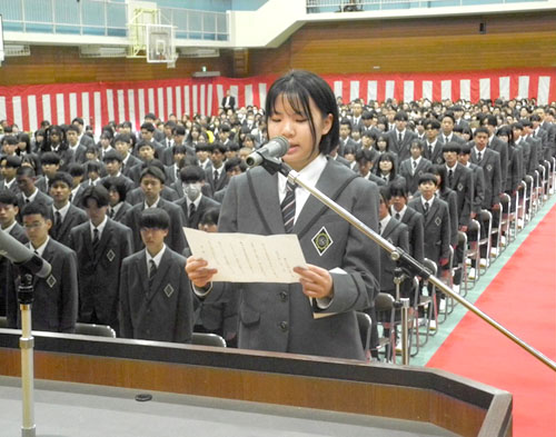 続いて新入生代表の中島真琴さんが「自覚と誇りを持ち、夢の実現に向けて、実りある高校生活を送ることを誓います」と宣誓した。