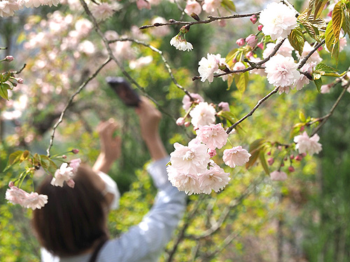 中でも注目を集めるギョイコウは、淡い緑色の花びらが特徴の八重咲き。江戸時代に京都の仁和寺で栽培されたのが始まりとされ、花の色が平安時代の貴族の衣装を思わせることが名前の由来といわれている。 同センターによると、今年は例年より数日早い14日ごろから咲き始め、来週いっぱいは楽しめそうという。 同町内から来ていた女性(60)は「ここに来ればさまざまな桜が見られるので、毎年楽しみにしています。今年もとてもきれいです」と笑顔で話していた。 開門時間は平日午前9時から午後5時まで。入場無料。写真上(クリックで拡大)=ギョイコウ(17日)写真下(クリックで拡大)=カマタリザクラ(17日)