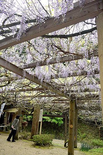 写真(クリックで拡大)=棚から房を伸ばす才ノ神の藤(27日午前9時50分ごろ)