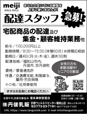 このホームページに使用している記事、写真、図版はすべて株式会社両丹日日新聞社、もしくは情報提供者が著作権を有しています。全部または一部を原文もしくは加工して利用される場合は、商用、非商用の別、また媒体を問わず、必ず事前に両丹日日新聞社へご連絡下さい。