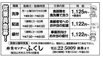 | 職種 | ①洗浄 ▶食器類を洗浄機で洗う ②配送 ▶高齢者宅へのお弁当の配達 ③盛付 ▶事業所向け お弁当の盛付 |