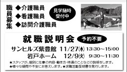 就職説明会 予約不要サンヒルズ紫豊館 11/27㈭ 13:30~15:00岩戸ホーム 12/9㈫ 9:30~11:30