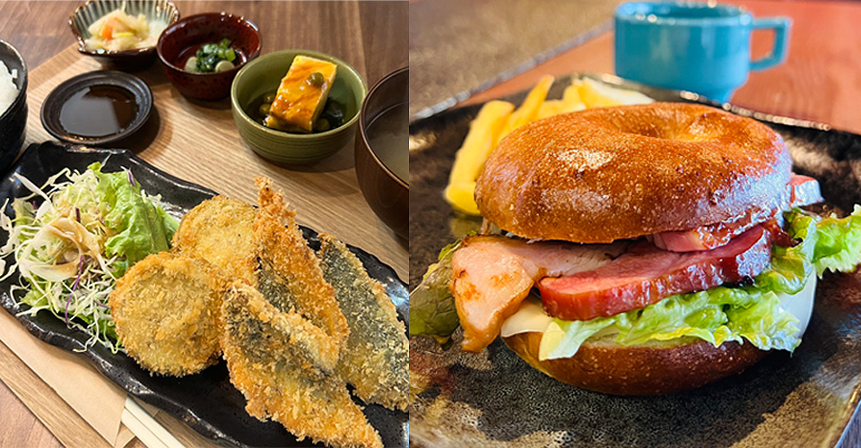 弁当の配食業を営むオーナーの大槻拡矛さんが「地域の方が気軽に集える場所、そして六人部地域の魅力を多くの方に知ってもらえる場所に」との思いで開店。古民家を改築した店内は、座敷やテーブル、カウンター席を備え、ゆっくり食事を楽しめる。ランチは煮込みハンバーグやフライなど、週替わりの2種類。地元野菜を使う小鉢も添えられ、栄養もボリュームも満点。厚切りベーコンやクリームチーズをサンドして提供する自家製ベーグルもおすすめ。自家焙煎コーヒーと一緒に。