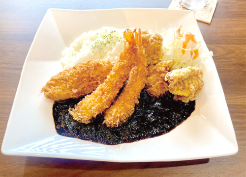 「黒カレー」にサクサクのエビフライ、白身フライ、唐揚げを乗せた「ご褒美黒カレー」(2400円)